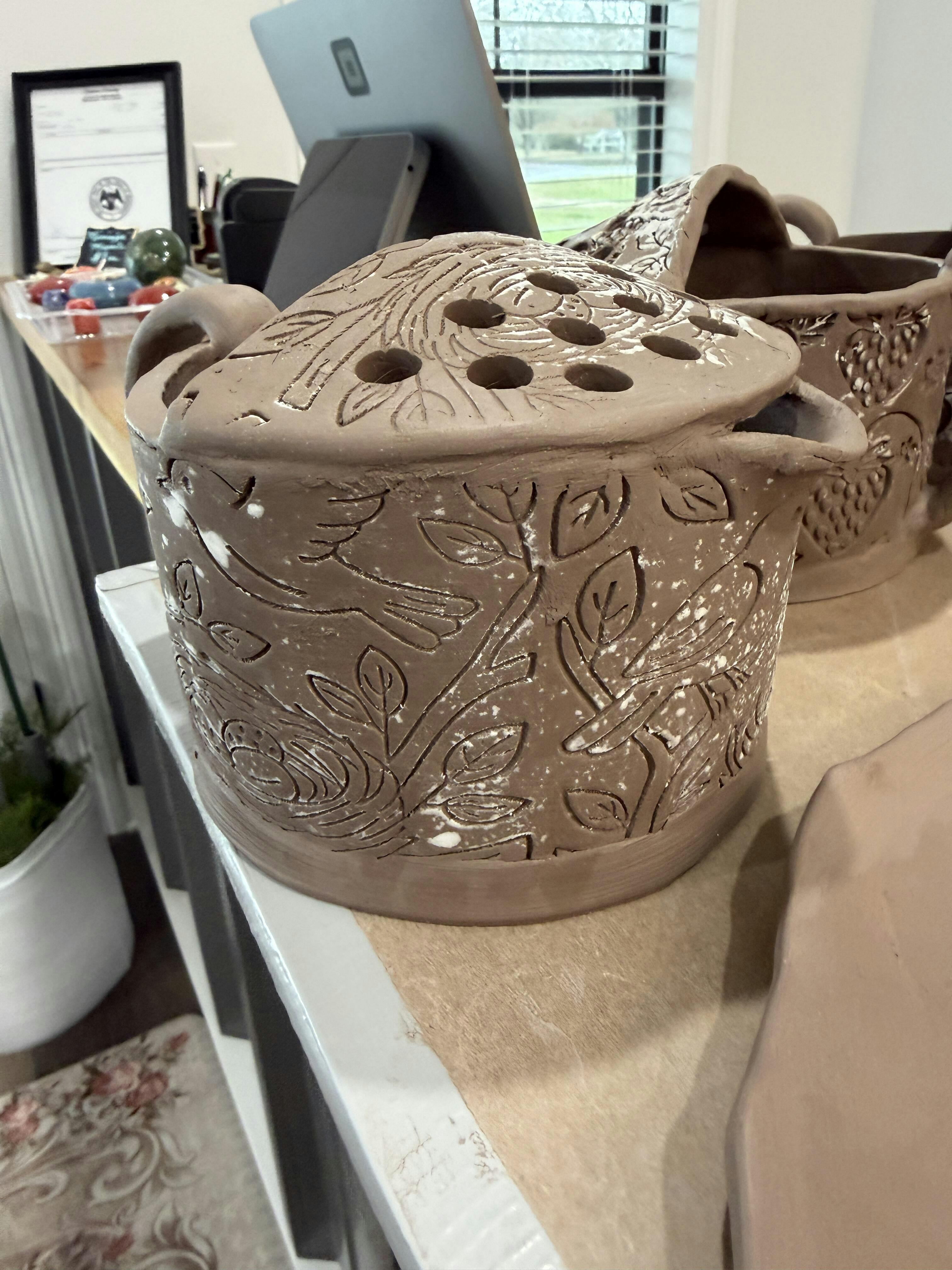 3D printed textured roller featuring a bird's nest in a tress with eggs and birds. Can be used for pottery, baking, crafting, etc.