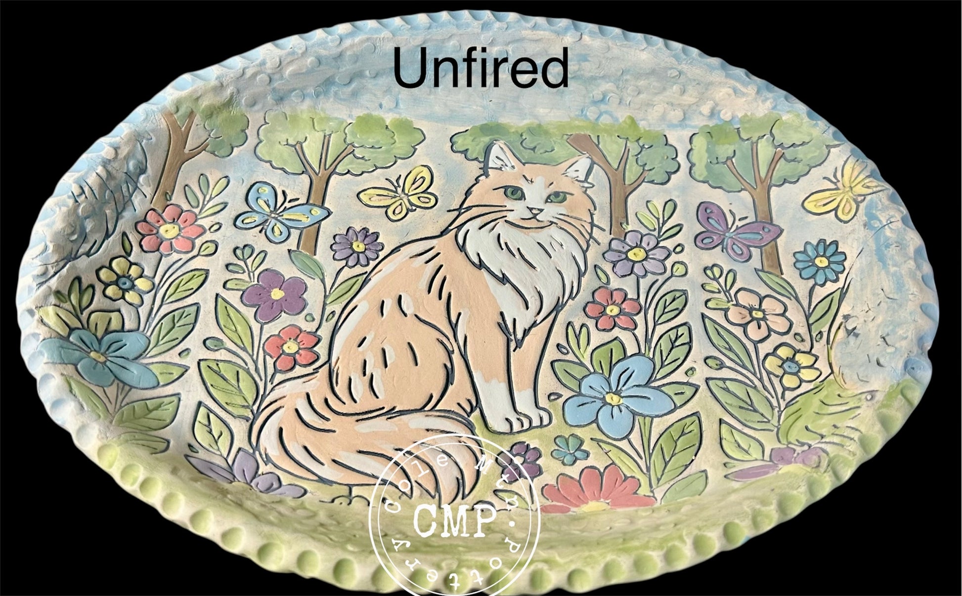 3D printed textured roller featuring a fluffy cat surrounded by flowers, butterflies, and trees. Can be used for pottery, baking, crafting, etc.