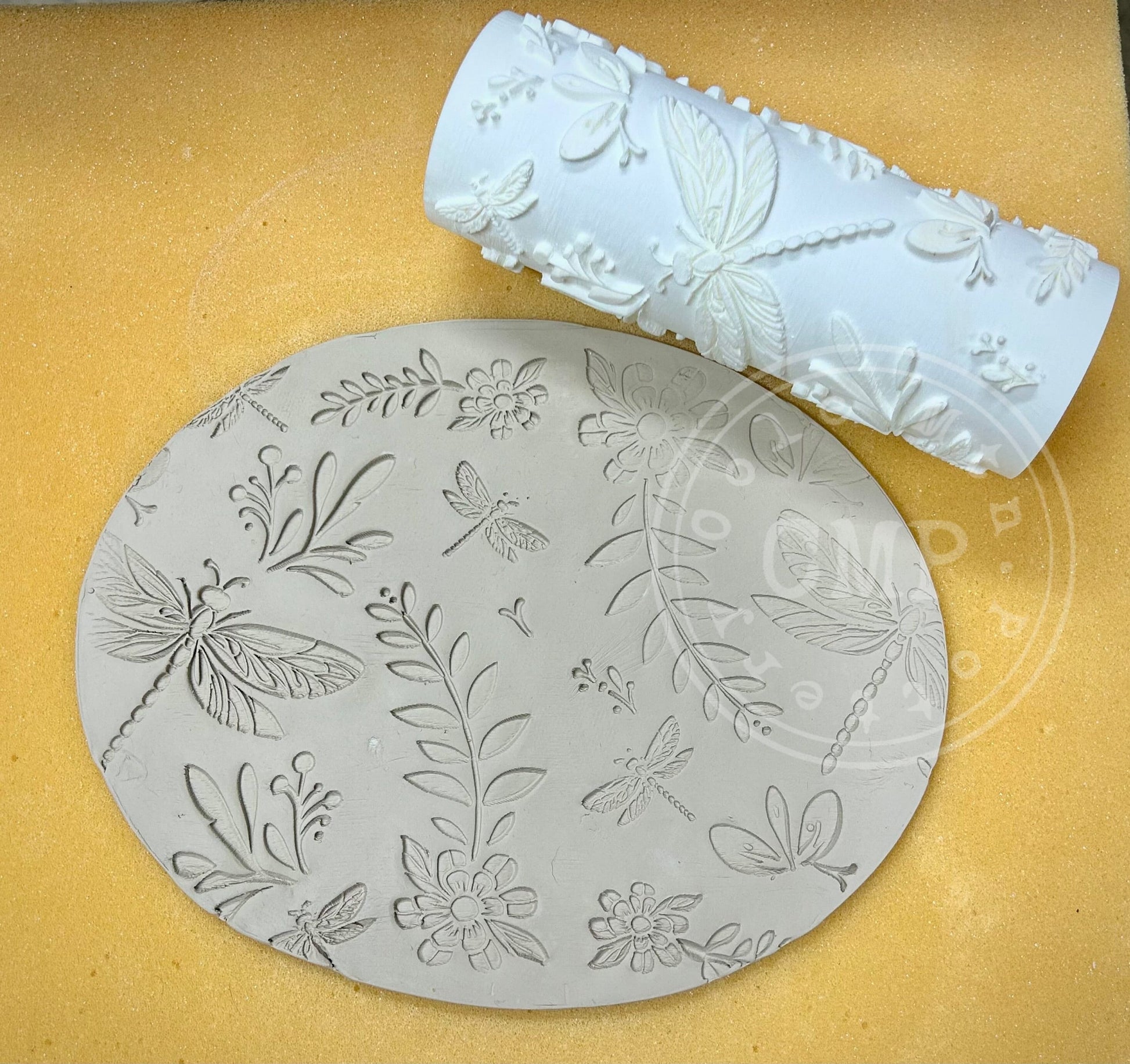 1) 3D printed textured roller featuring Dragonflies with various flowers - Approx. 7" inches tall by 2 .75" wide.