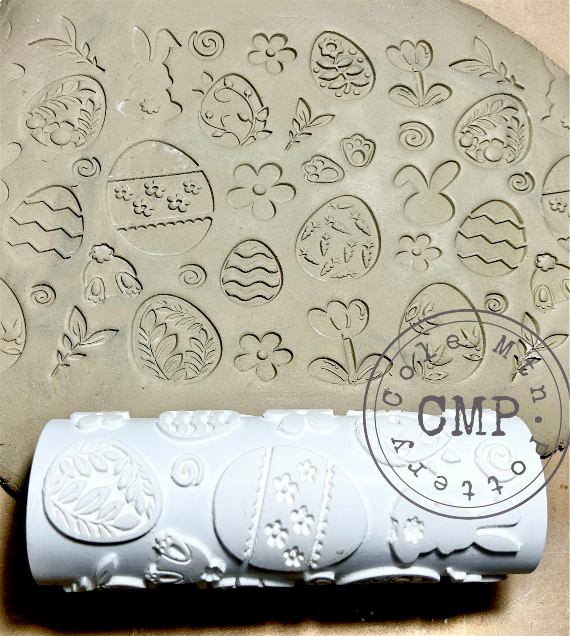 3D printed textured roller featuring various Easter eggs, bunnies, and flowers. Can be used for pottery, baking, crafting, etc.