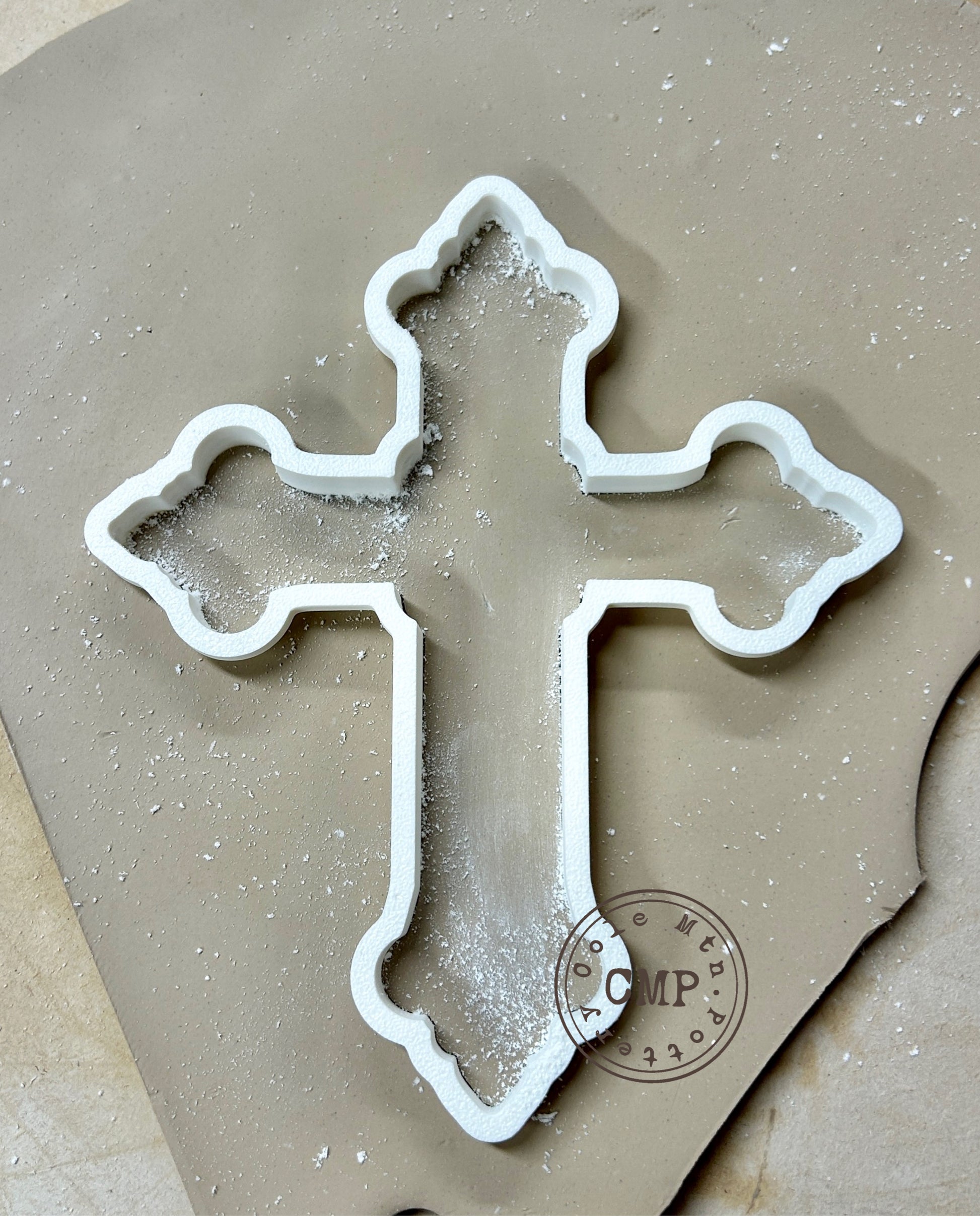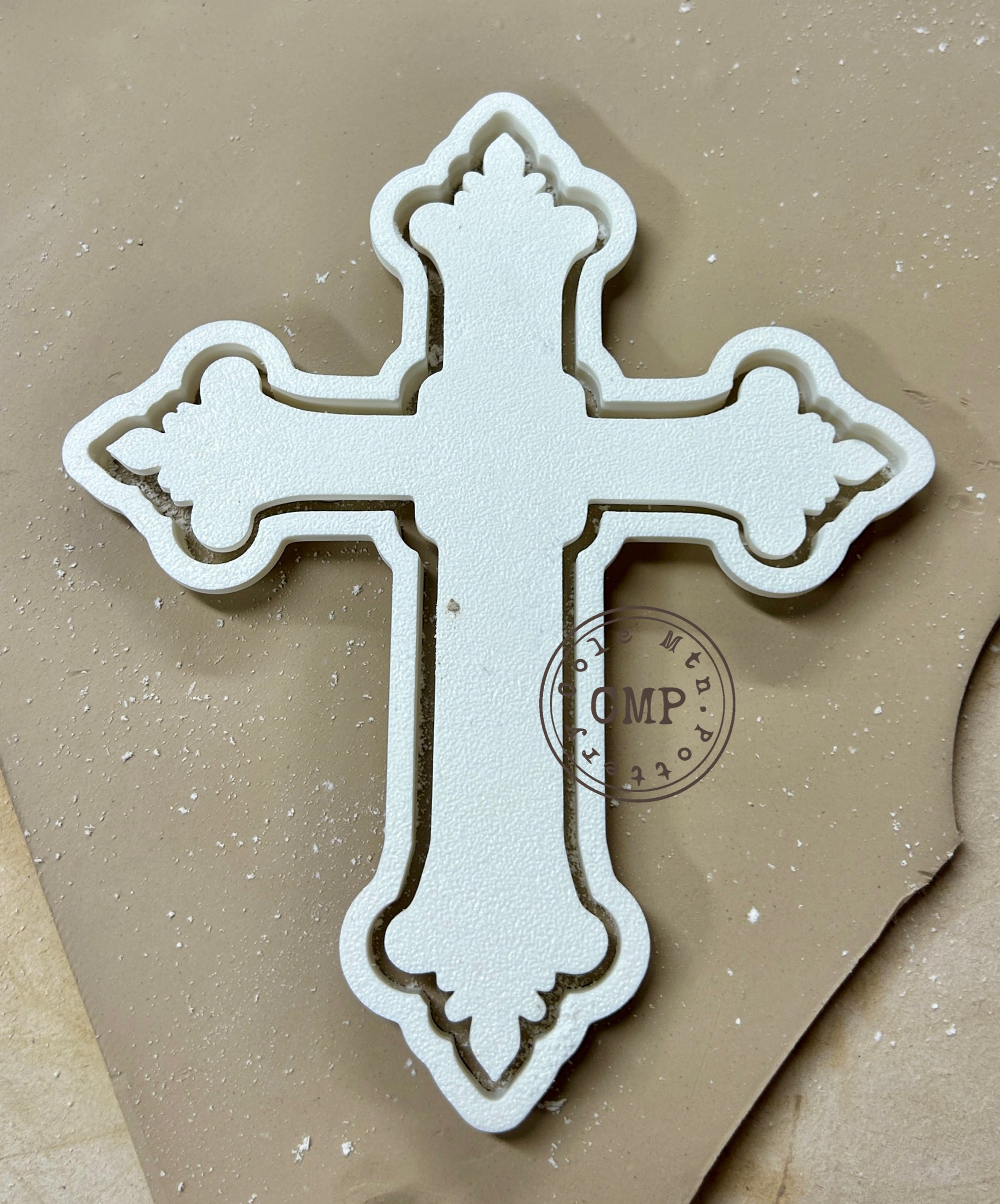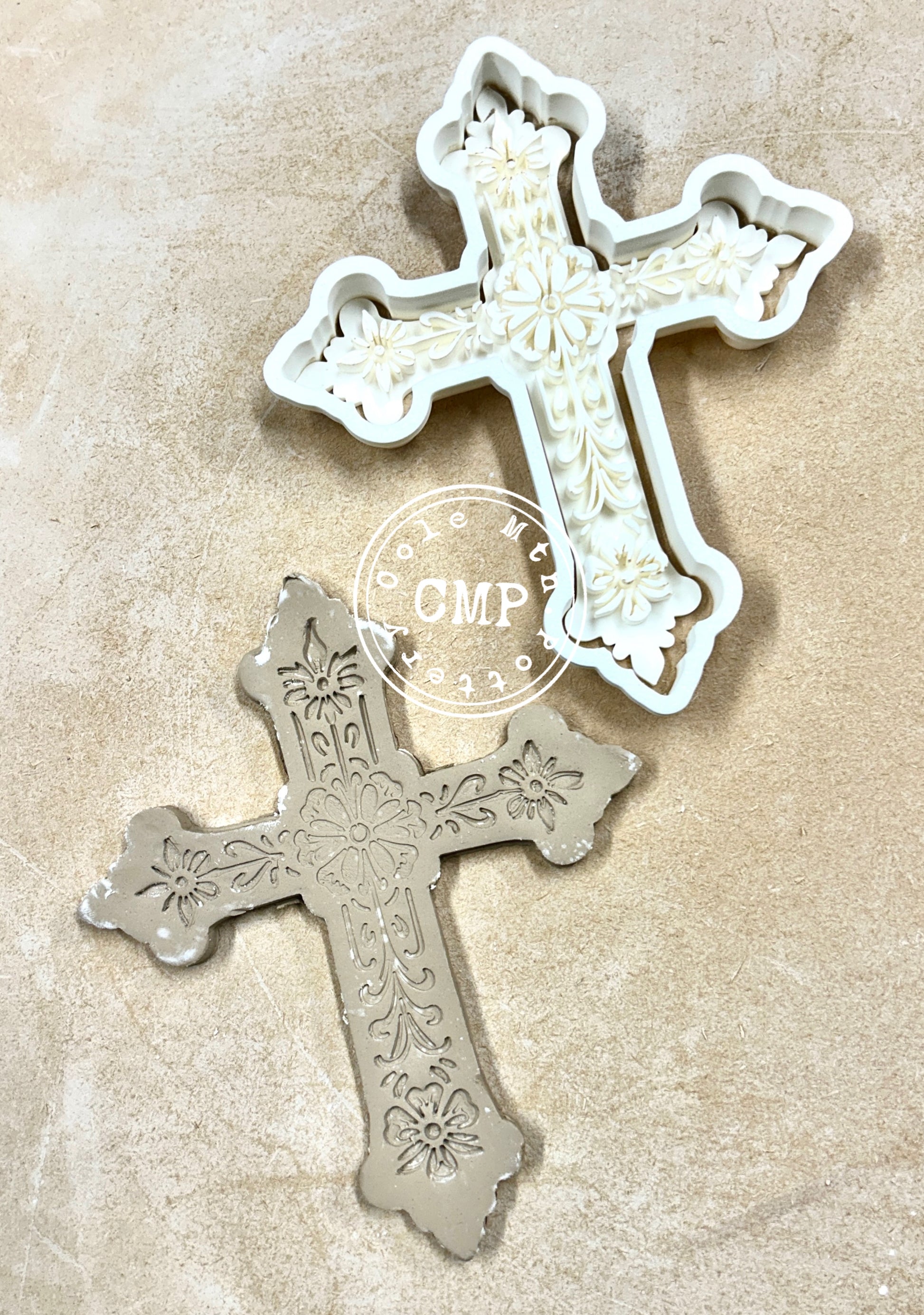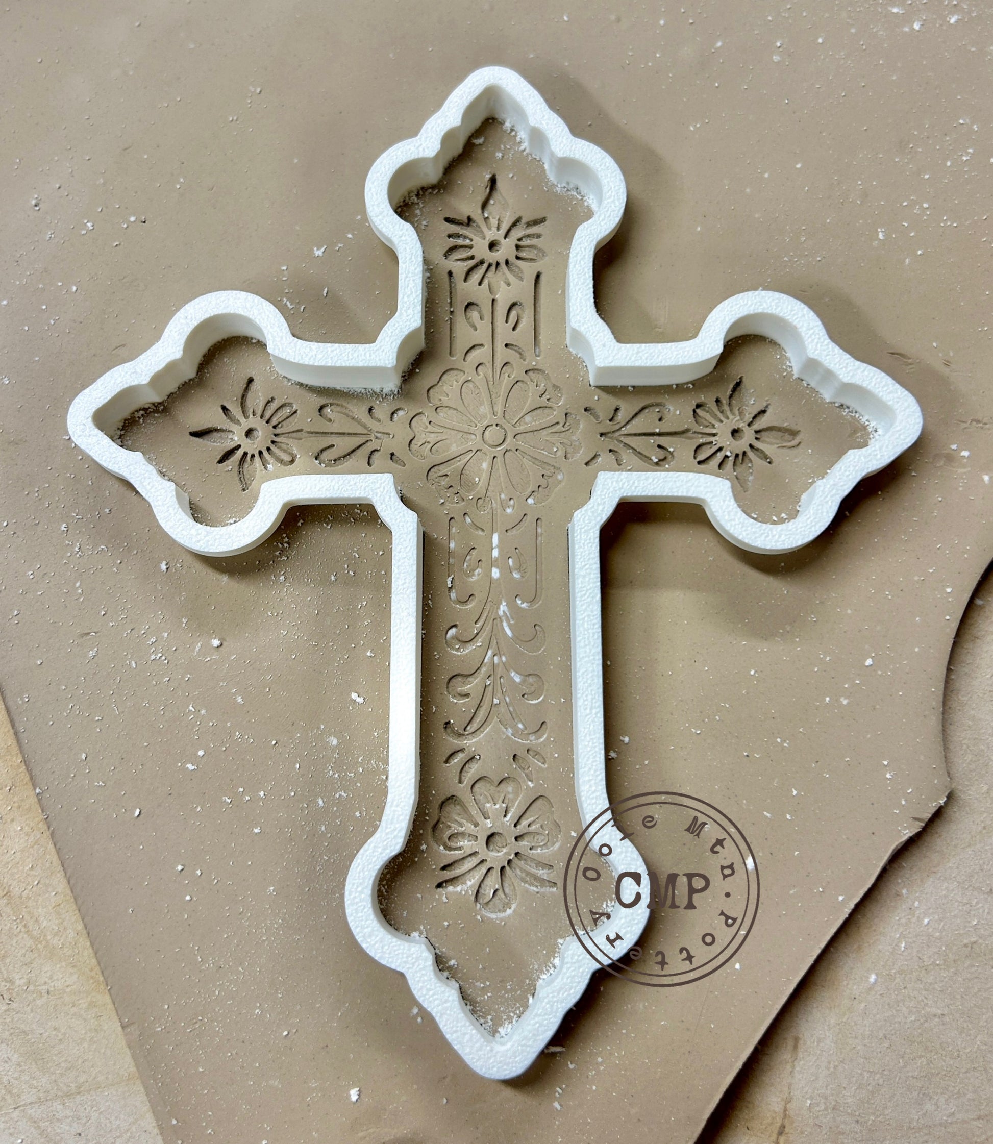 3D printed stamp and cutter combo featuring a flourish cross with flower accents. Can be used for pottery, baking, crafting, etc.