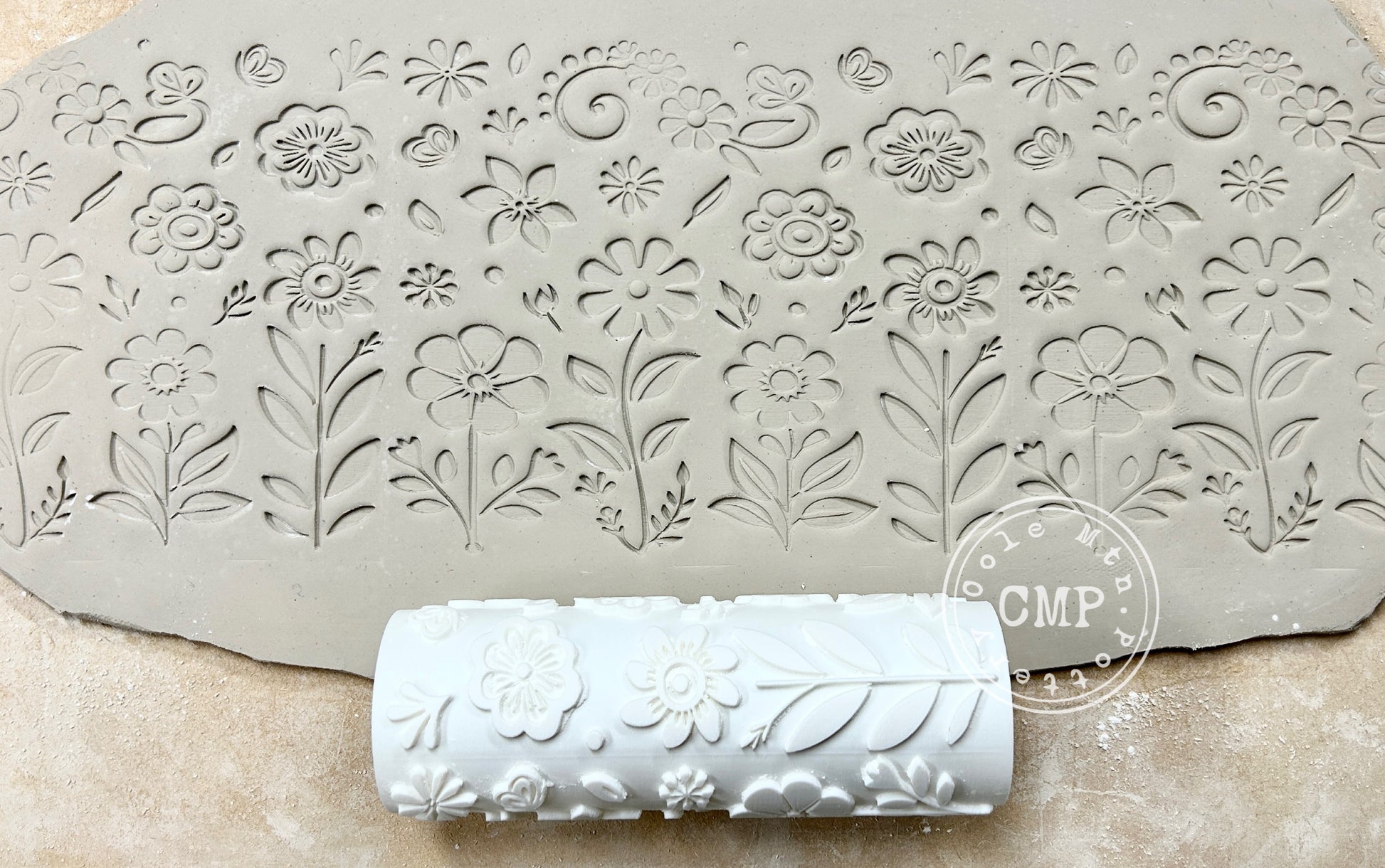 3D printed textured roller featuring various flower designs. Can be used for pottery, baking, crafting, etc.