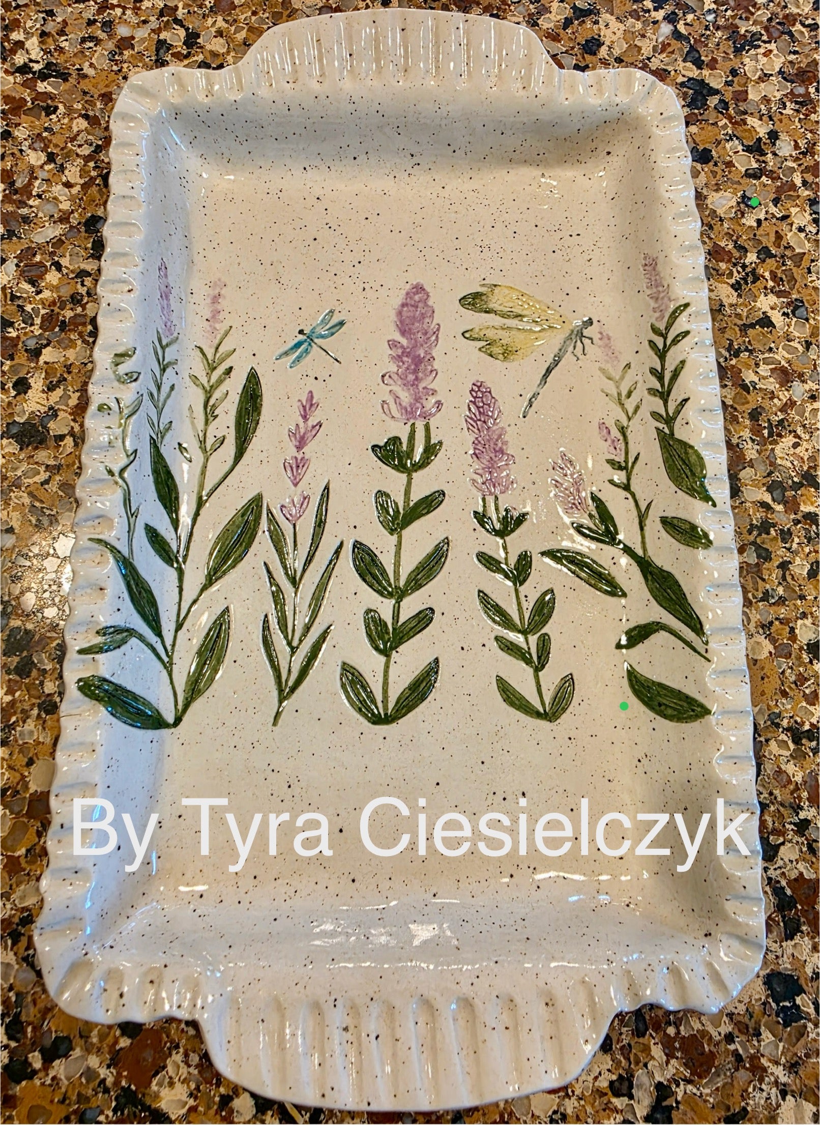 3D printed textured roller featuring various lavender sprigs and dragonflies. Can be used for pottery, baking, crafting, etc.