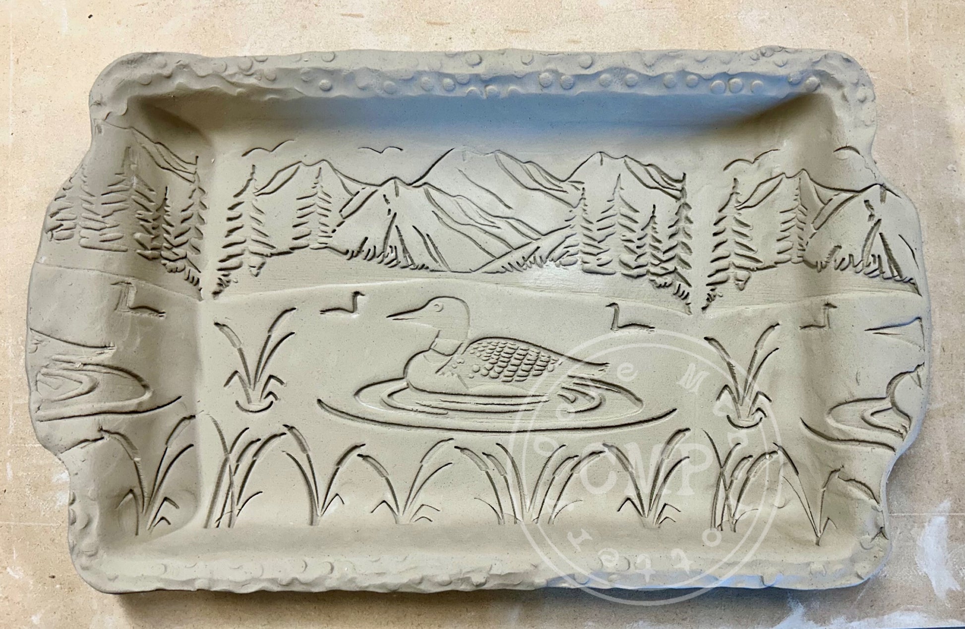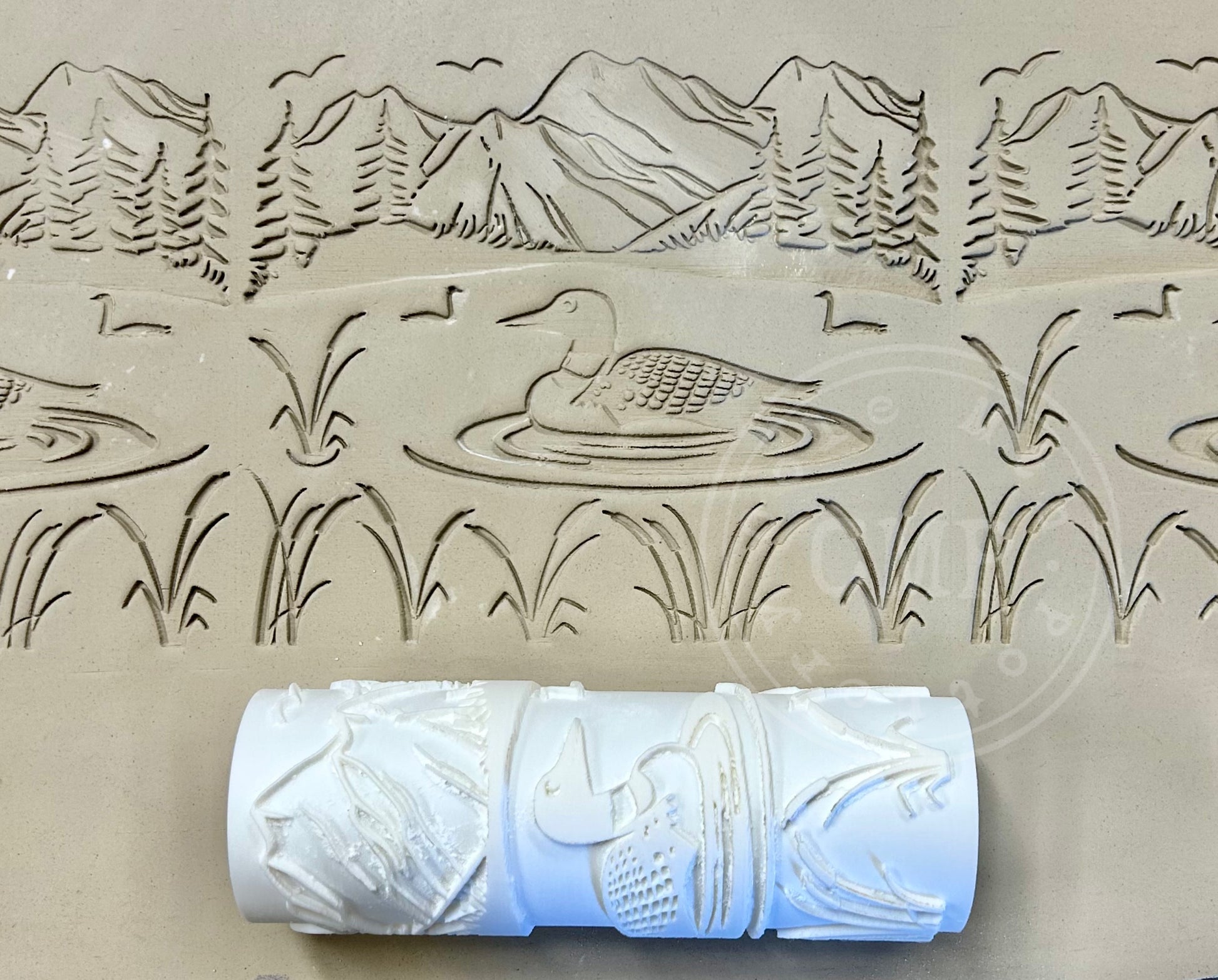 3D printed textured roller featuring a loon sitting in a lake surrounded by mountains, and trees. Can be used for pottery, baking, crafting, etc.